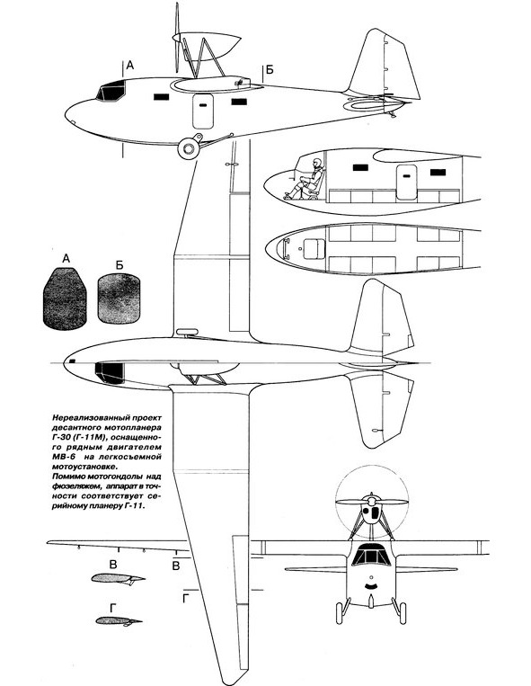Что же представлял собой планер, которому в Наркомате авиационной промышленности присвоили название Г-11? Почему собственно Г-11, когда последняя конструкция отца носила порядковый номер Г-29? Потому, что новый планер мог поднимать в воздух десять бойцов с вооружением и пилота, то есть всего одиннадцать человек. В перечне конструкций, созданных отцом, транспортно-десантный планер носит порядковый номер 29.