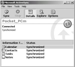 ActiveSync автоматически отслеживает наличие присоединенного к компьютеру мобильного устройства и, при наличии физического соединения, устанавливает связь и выполняет синхронизацию настольного компьютера и Pocket PC. Таким образом, основное назначение ActiveSync – это автоматизированная синхронизация различных баз данных Pocket Outlook и папок на мобильном компьютере с соответствующими базами данных и папками на настольном компьютере. Кроме этого, при помощи ActiveSynс выполняются операции, перечисленные в следующем списке.