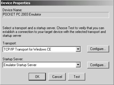 В выпадающем списке Transport нужно выбрать значение TCP\IP Transport For Windows CE, а в списке Startup Server выбрать значение Emulator Startup Server. После нажатия на кнопку Configure, которая относится к списку Startup Server, еще одно окно настройки будет выведено на экран (рис. 2.5).