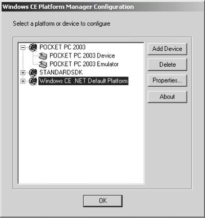 Между эмулятором и средой разработки существует соответствующий программный слой. Эта технология обеспечивает взаимодействие среды разработки с реальным устройством или эмулятором. Этот программный слой называется Platform Manager и позволяет среде разработки установить сетевое соединение с устройством (эмулятором), загрузить на него файлы и произвести основные операции отладки на уровне приложения. Сам пакет Platform Manager и вспомогательные инструменты отладки располагаются в каталоге C: \Program Files\ Common Files\Microsoft Shared\Windows CE Tools\Platman\bin\wce420. Каждый из инструментов Platform Manager и каждая среда разработки Microsoft, предназначенная для работы с Pocket PC или Windows CE, имеет в меню команду Configure Windows CE Platform Manager…, которая позволяет настроить запуск нужного эмулятора и в интерактивном режиме отредактировать ключи командной строки.