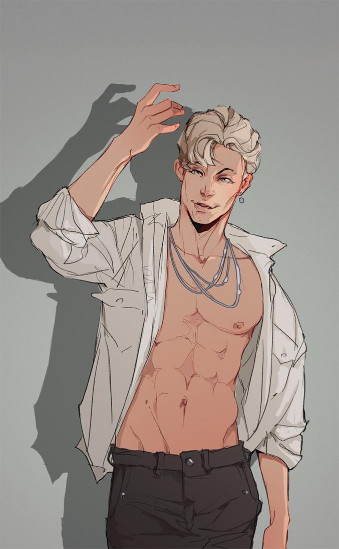 Кэлз уже переоделся и сейчас щеголял в зауженных штанах из плотной замши и темно-вишневой шелковой рубашке, которая частично выбилась из-под ремня с крупной серебряной пряжкой, инкрустированной камнями, напоминающими капли крови. Пуговицы парень не застегивал, видимо принципиально, демонстрируя защитный амулет с рубином в оправе белого золота и загорелую прокачанную грудн