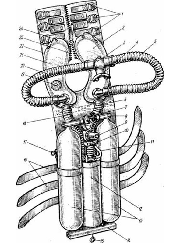 1 — пряжки; 2 — мешок вдоха; 7 — клапанная коробка; 4 — загубник; 5 — трубка вдоха: 6 — соединительная трубка; 7 — запорный вентиль; 8 — тройник; 9 — редуктор; 10 — блок дозировки; 11 — трубка подачки газа; 12 — коробка поглотителя; 13 — газовые баллоны; 14 — панель; 15 и 17 — кольца: 16 — ремни; 18 — соединительная трубка выдоха; 19 — травящий клапан; 20 — трубка выдоха; 21- мешок выдоха; 22 — подкладка; 23- застежка типа «молния»; 24 — спускная пробка.