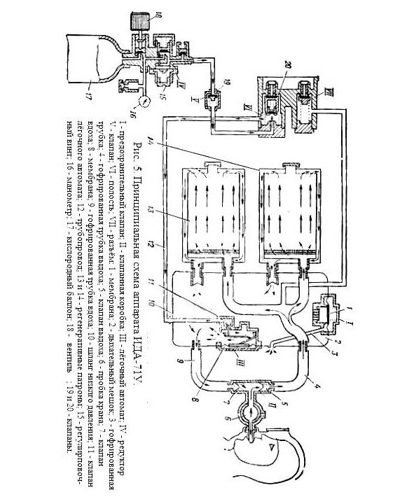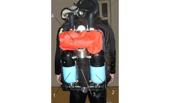 В России в 1973 г. был создан дыхательный аппарат ИДА-71, которым пользовались военные. Для выработки кислорода в нём использовалось вещество О3. Это аналог пластин ВПВ, которые используются в регенеративных патронах для выработки кислорода на подводных лодках, только здесь оно засыпается в регенеративную коробку в виде гранул (за рубежом это вещество не выпускается). Кислородный баллон малой ёмкости — 1,3 л был необходим только для заполнения дыхательного мешка при погружении. Поскольку это кратковременный режим, а основной режим — плавание на постоянной глубине, то работало в основном вещество О3, которого хватало на 5 — 6 часов плавания (в зависимости от температуры воды). Принципиальная схема дыхательного аппарата ИДА-71 приведена на рис. 5.