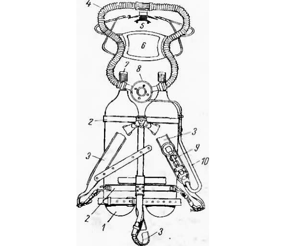 1 — стальные баллоны со сжатым до 150 атм воздухом; 2 -бугель крепления баллонов; 3 — ремнн; 4 — шланги; 5 — загубник; 6 — наголовник для удержания загубника; 7 — запорные вентили баллонов; 8 — дыхательный автомат с редуктором; 9 — манометр, показывающий давление в баллонах; 10 — гибкий шланг подачи воздуха на манометр.