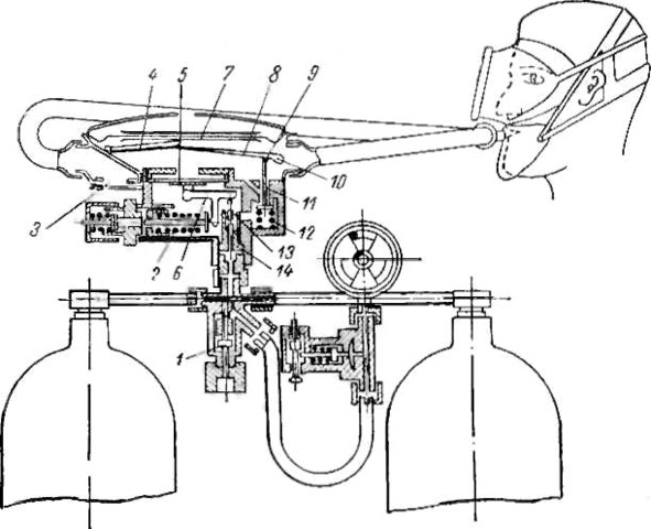 1 — вентиль; 2 и 12 — пружине; 3 — резиновый клапан выдоха; 4 и 6 — рычаг; 5 и 8 — мембрана; 7 — дыхательный автомат; 9 — винт; 10 — оси 11 — шток автомата; 13 — толкатель; 14 — клапан.