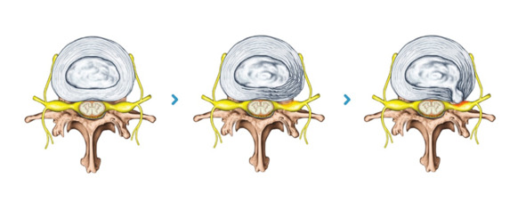 Что такое грыжа? Вспомним анатомию позвоночника. Между позвонками находится межпозвоночный хрящ, который выполняет функцию амортизатора, подобно подушке. В самом межпозвоночном хряще выделяют две части — внутреннее пульпозное ядро и наружное фиброзное кольцо. Фиброзное кольцо представляет собой плотную часть, которая сохраняет целостность диска. Вследствие травмы возникает повреждение диска в виде надрыва фиброзного кольца, тогда внутренняя часть хряща начинает выпячиваться наружу. Собственно, это состояние и называют грыжей диска.