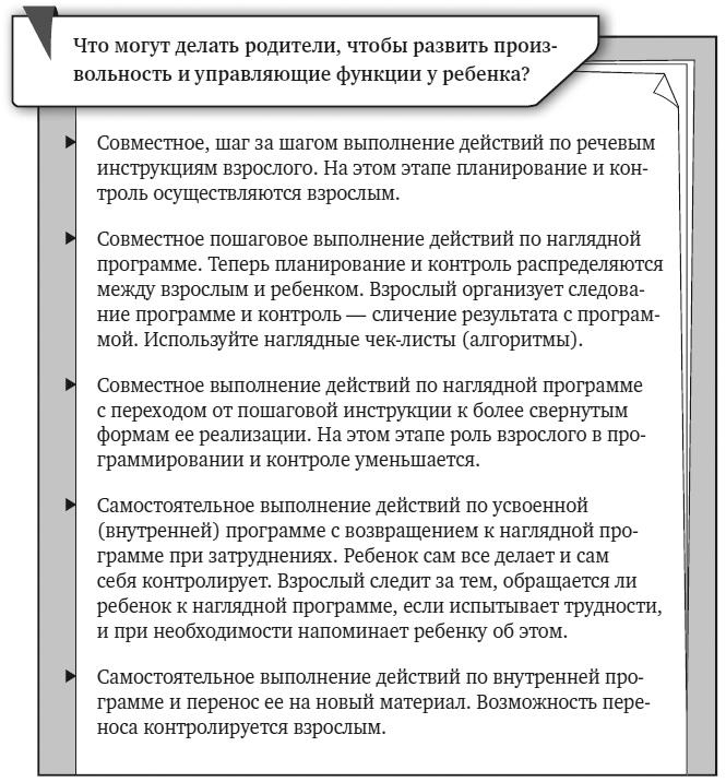 Функции программирования, регуляции, планирования и самоконтроля можно называть управляющими. Произвольные функции – умение действовать по заданной инструкции или придерживаться собственного плана, не отвлекаясь на сиюминутные порывы. Состояние, когда эти функции не развиты, часто связывают с дефицитом внимания.