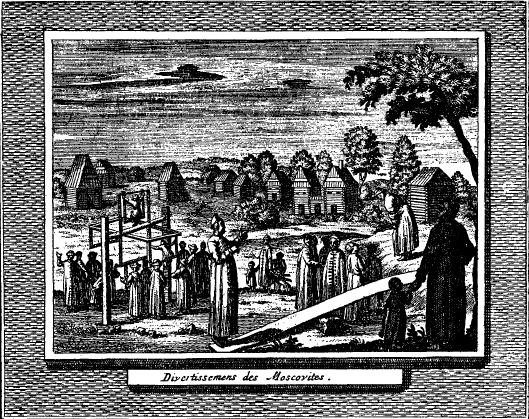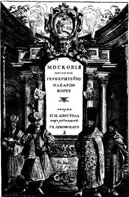 Обзоръ хотя бы трехъ-четырехъ авторовъ изъ собранія Апостола даетъ уже такой богатый матеріалъ для характеристики Россіи XVI-XVII вѣковъ, что мы и ограничимся пока репродукціями гравюръ изъ этихъ книгъ. Когда я пересматривалъ чудесныя in quarto и in folio, въ одинъ изъ уютныхъ вечеровъ, проведенныхъ мною въ Парижѣ, въ квартирѣ П. Н. Апостола, у меня явилась мысль подобрать такіе наиболѣе интересные моменты изъ русской жизни, которые будутъ характерны для пониманія иностранцами Россіи — тогда Московіи.