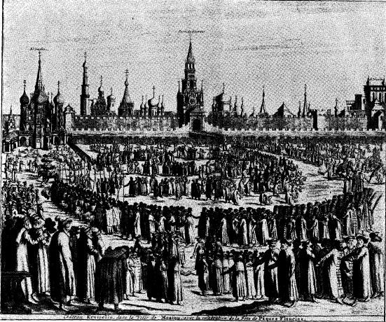 Великій князь, котораго въ предыдущій день просили о позволеніи посмотрѣть на это зрѣлище, прислалъ посламъ обычныя ихъ двѣ лошади и еще 15 лошадей. Противъ воротъ Кремля намъ отвели просторное мѣсто, а русскихъ, которыхъ передъ Кремлемъ собралось болѣе 10-ти тысячъ человѣкъ, велѣно было отстранить, чтобы мы лучше могли видѣть процессію.