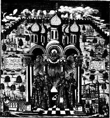 Рис. на стр. 27Царь Ѳеодоръ, Царь Іоаннъ, Царь Петръ (изъ книги «Das veränderte Russland», 1721).