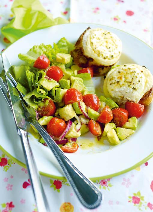 - Сыр нарежьте на четыре кружочка и положите каждый кружочек на кусочек багета. Смажьте небольшим количеством оливкового масла и присыпьте прованскими травами. Переложите кусочки багета с сыром на противень, застеленный фольгой, и поджарьте до золотистой корочки на гриле.