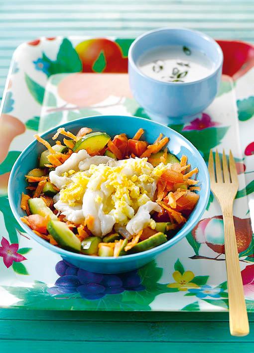 - Смешайте все овощи и выложите на тарелку. Добавьте рыбу. Сверху полейте соусом. Яйцо разомните вилкой и посыпьте на салат.