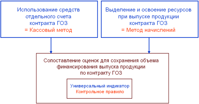 Рассмотренные примеры содержат операции, направленные на исполнение контракта, но охватывают непересекающийся состав действий. Совместное использование кассового метода и метода начислений позволяет говорить о создании системы дополняющих контролей исполнения контракта в сфере ГОЗ.