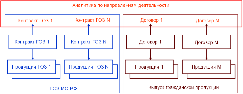 На нижнем уровне иерархической структуры аналитики Направление деятельности выделяются отдельные контракты ГОЗ и договоры с коммерческими заказчиками.