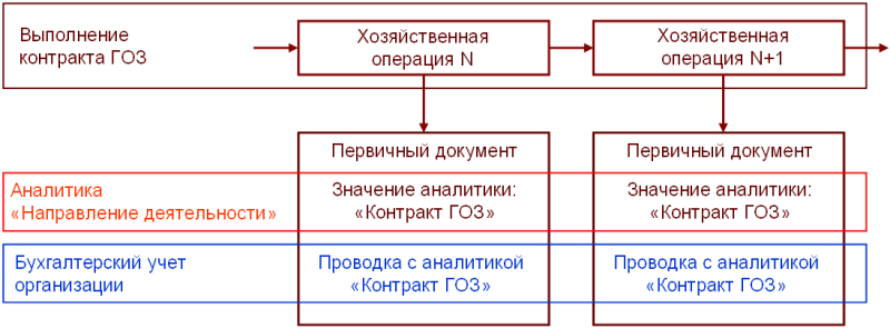 Рис. 1.5. Использование аналитики «Направление деятельности» при регистрации фактов хозяйственной жизни, в том числе операций выполнения контракта ГОЗ