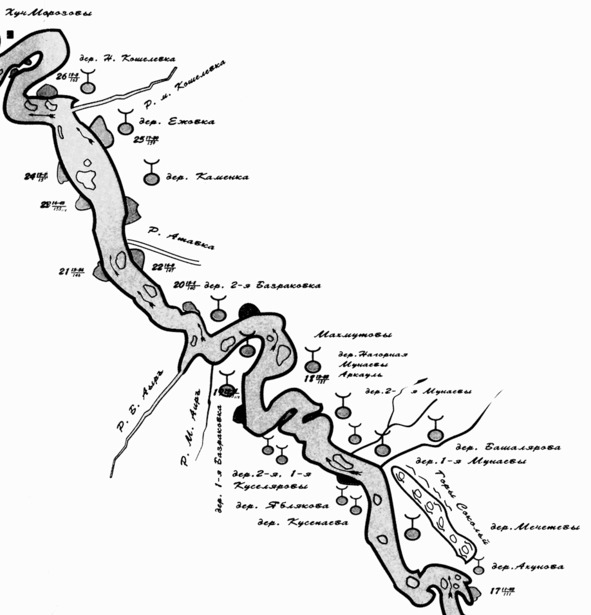 Ниже по Юрюзани, чем ближе к окраине Дуванского района, тем плотнее было население. Деревни по берегу реки строились почти впритык одна к другой, особенно в послереволюционный период и до начала организации колхозов. Точнее 1920–30 годы.
