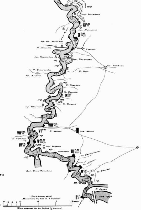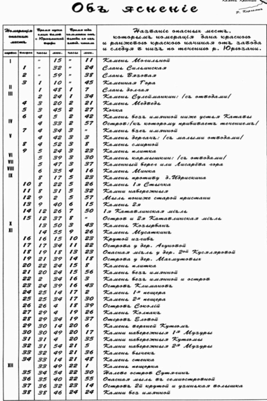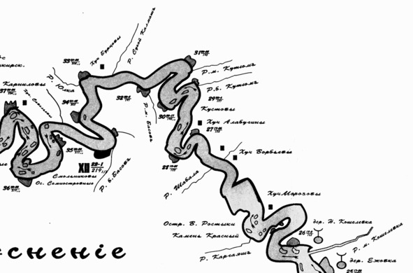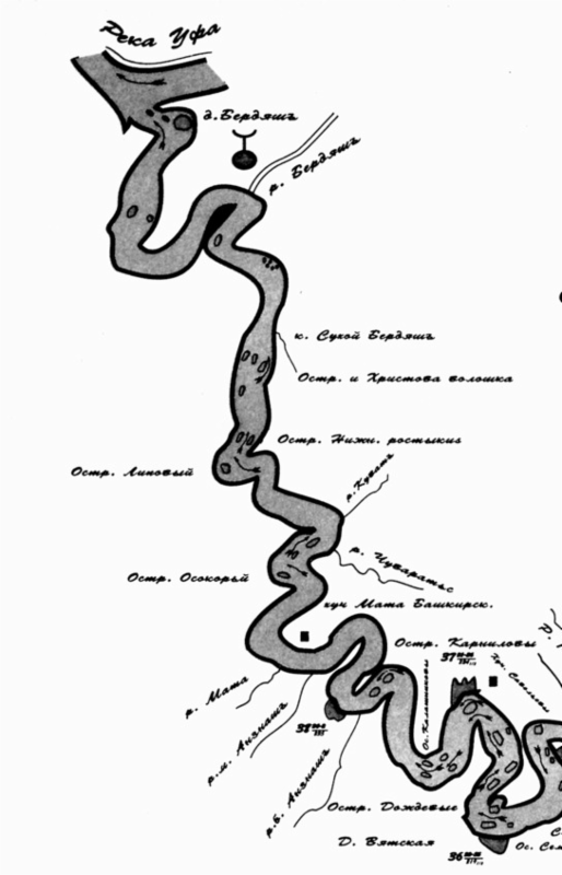 В наследство от тех лет нам остался уникальный документ: карта-лоция Юрюзани от Юрюзанского завода до впадения её в Уфу. Копия этой карты вложена в первый том А. Ф. Мукомолова «На южноуральских заводах». К сожалению, нет никаких сведений относительно года издания этой схемы, однако судя по нанесённым на неё поселениям, это предположительно середина XIX века. В Списке населённых мест Российской империи за 1870 есть ссылка на лоцию Юрюзани, напечатанную в №19 Уфимских губернских ведомостей за 1867 г. Возможно, это и есть та самая, которую привёл А. Ф. Мукомолов. Карту я скопировал в РГБ (бывшая Ленинская библиотека) и для помещения в книгу был вынужден перевести в чёрно-белый режим. В книге она большого формата, как 4 сложенных листа А4. Фотографии размещены по течению реки от заводов к устью (рис. 32–38).