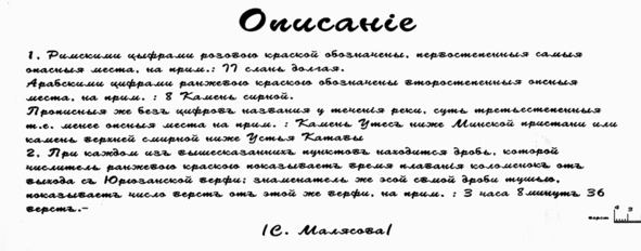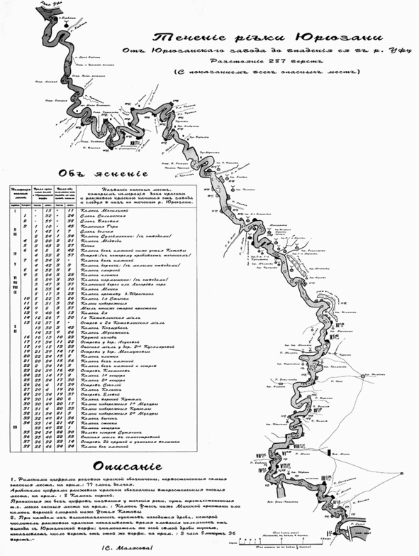 Масштаб карты — 4 версты в одном дюйме, однако для русла реки масштаб увеличен в 8 раз — 1/2 версты в дюйме. На схеме река в таком масштабе напоминает огромного удава. Изучение карты даёт много информации, однако же не всегда понятной, поскольку источников того времени крайне мало. Очень интересно сравнить тогдашние названия с современными. Деревни Малаясы — нынешний Малояз, и т. д. Очень интересно названы горы Янгантау: «Горы всегда горящие». На карте показан хутор Бурцова (нынешняя Бурцевка), однако отсутствует Сафоновка. Бурцевка старше Сафоновки? В таком случае она образовалась ранее 1832 года… Хутор Савельевы (уже известный нам хутор Савин или Савкин) — будущая Трапезниковка. Ручей Юлка ниже Бурцевки — лог Юлай (Юлайко). Нет никаких сведений о деревне Вятская ниже острова Семиостровные (на современных картах — о. Семиостровный). Возможно, это бывшее монашеское поселение в Семиостровном. Также можно предположить, что речь идёт всё-таки о Сафоновке, по преданию основанной выходцами из Вятской губернии, а составитель карты неверно указал её местоположение — неточностей именно в изображении прилегающей к реке территории на схеме много, что вполне объяснимо: составителей интересовала в первую очередь река и опасные места на ней. Так, неверно показан лог Малый Басав, отсутствует ручей Сырой Калмаш — заметный ориентир на реке. Лог (на схеме все лога обозначены как ручьи) Башала назван Шабала — явная описка, переставлены буквы.
