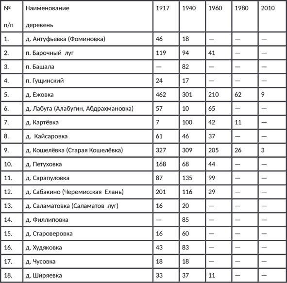 — Посёлок Елабугин (Абдрахманова) — 6 дворов, жителей 18 (м) и 19 (ж).