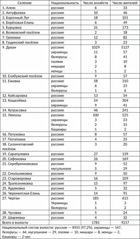 — Выселок Черемисская Елань (Староверовка) — 6 дворов, жителей 25 (м) и 27 (ж). Два смоляных заведения.