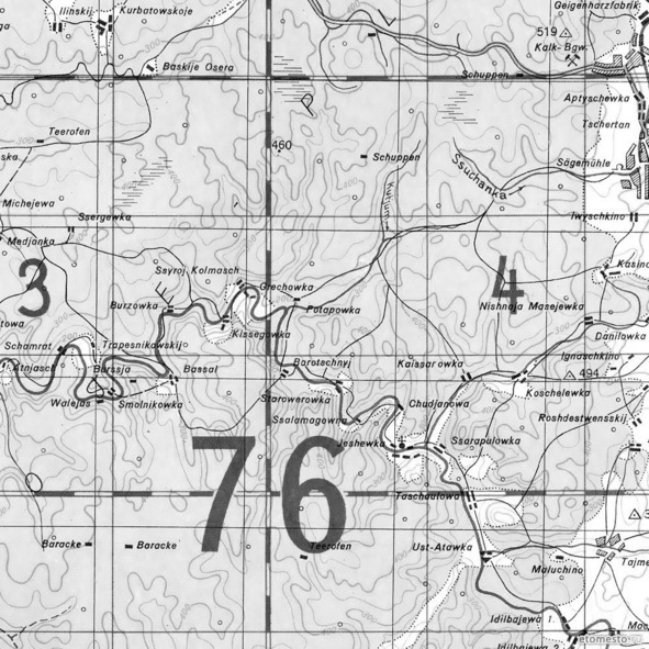 О двух картах, показанных на рис. 15 и 16, хотелось бы сказать особо. Рис. 15 — это выкопировка с немецкой карты 1941 года[38]. Уж не знаю, насколько серьёзно немцы собирались дойти до Урала, однако нельзя не отметить высокое качество изготовления этой карты. Она единственная, на которой показаны почти все населённые пункты; правда, зачастую с искажённым написанием, однако знающему язык догадаться нетрудно. На карту нанесены также лесные тропы и предприятия — как правило, крошечные. В правом верхнем углу показаны канифольный завод — Geigenharzfabrik и предприятие по производству извести — Kalk-Bgw. Вблизи Дувана на опушке леса находилась лесопилка — Sägemühle. Показаны также печи для выгонки дёгтя из берёзовой коры — Teerofen. Но самое интересное находится в левом нижнем углу участка карты: Baracke (бараки). Это не что иное, как спецпосёлки или лагеря, о которых речь пойдёт ниже. Их сознательно строили вдали от реки, где жило местное население, среди дикого леса. Один из этих посёлков наверняка является лагерем Кульвараш (встречается и другое написание — Кульваряш), о котором мало кто из местных жителей слышал, а вот немцы, оказывается, знали. Я так точно узнал о нём лишь несколько лет назад, когда начал интересоваться историей своей малой родины.