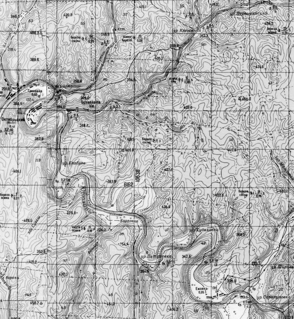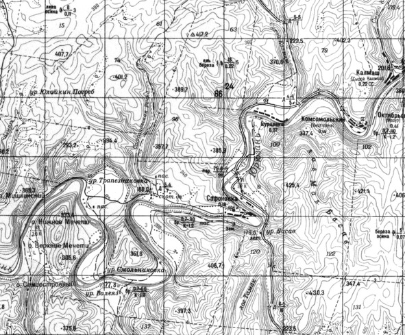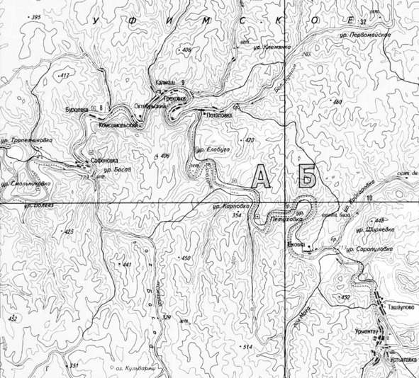 На рис. 17 и 18 — карта-километровка Генштаба по состоянию на 1984 год. Это самые подробные карты, имеющиеся в открытом доступе[40] и рассекреченные лишь в 1990 году. Деревни на Юрюзани показаны уже как урочища, за исключением Ежовки и Греховки, доживающих последние годы, Потаповки, Октябрьского, Калмаша, Комсомольского, Бурцевки и Сафоновки.