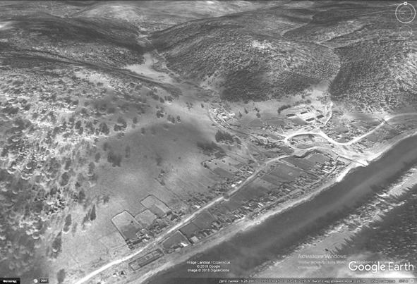 Калмаш на имеющихся картах появился впервые лишь в 1941 году (на рис. 15 он обозначен как Ssyroj Kolmasch). Посмотрим на посёлок с высоты птичьего полёта — технический прогресс даёт нам такую возможность. Вообще-то подобные снимки делаются сейчас с помощью дронов, но дрона у меня нет, зато есть космические снимки Гугла (рис. 20). Сейчас, когда я уже много где побывал и много чего видел, могу предполагать, что почти каждый, увидев эту фотографию, воскликнет: «Что за райский уголок!». Пасторальная деревушка, притулившаяся на берегу чистой реки в окружении покрытых лесом пологих гор.