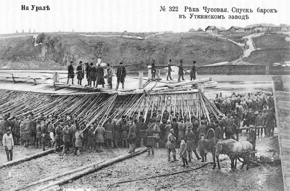 Искусственный подъём воды в реке путём синхронного спуска заводских прудов — гениальное изобретение, позволяющее сплавлять по сравнительно мелководной реке громадные суда, хотя и с небольшой осадкой (пять четвертей — это около 90 см). В результате такого спуска по реке катился довольно протяжённый водяной вал и надо было успеть провести поднятый им караван, пока запас воды в прудах не иссяк. Для обеспечения синхронности спуска воды и старта барок в те годы, когда ещё не изобрели ни радио, ни телеграфа, вниз по реке скакал вестовой, предупреждая о начале сплава. Разбросанные по реке сообщества действовали согласованно — как тут не вспомнить слова Ключевского! Мне попалось на глаза свидетельство знакомого блогера, нашего земляка, ныне живущего в Болгарии, который в сентябре 2009 года сплавлялся с болгарскими друзьями на катамаране по Юрюзани и они попали под такой сброс воды. Приведу цитату[46], исправив некоторые описки и название деревни Качкари на правильное Кочкари: