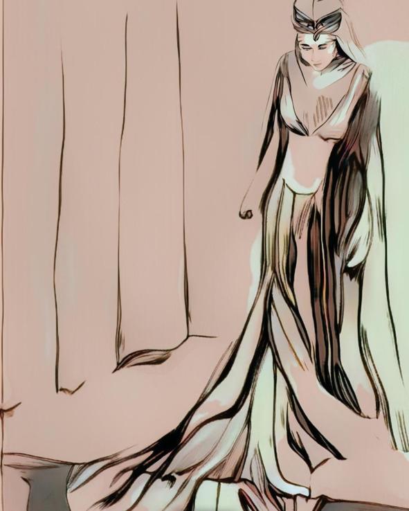Грациозная и изящная, она шла словно не касаясь пола. Одета в светлых тонах с золотыми украшениями. Ее волосы спадали на плечи, словно мерцающий водопад, украшенный тиарой из тончайше сплетенных нитей в завитки и косы.