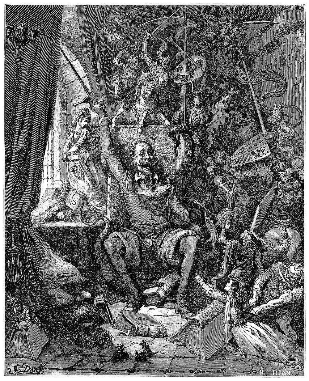 Прежде всего он приступил к чистке доспехов, которые принадлежали еще его прапрадедам и, изъеденные ржавчиной и плесенью, целые века оставались позабытыми и заброшенными где-то в углу. Он вычистил и выпрямил их как мог лучше, но заметил следующий большой недостаток: шлем был неполный, недоставало забрала и нижней части шлема, – это был простой шишак. Однако изобретательный ум его сумел помочь беде, и он из картона смастерил нечто вроде забрала, которое и прикрепил к шишаку так, что тот принял вид настоящего рыцарского шлема. Правда, с целью испытать прочность забрала и может ли он противостоять удару меча, он вынул свой меч, два раза ударил им по шлему и первым же ударом мгновенно уничтожил то, что он мастерил целую неделю. Не очень-то ему понравилась легкость, с которой он разнес вдребезги свое изделие, и, чтобы предохранить себя от той же опасности в будущем, он принялся делать новое забрало, прикрепив внутри его несколько железных полосок, и остался доволен его прочностью. Не желая его вновь подвергать испытанию, он решил, что оно вполне пригодно, и считал его прекраснейшим забралом.