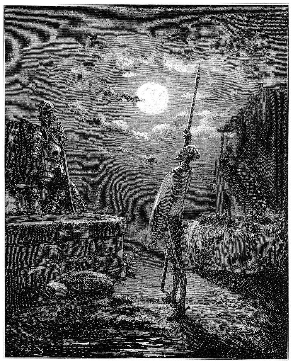 Одному из погонщиков, ночевавших на постоялом дворе, понадобилось напоить своих мулов, и для этого приходилось снять с водопойной колоды лежавшее на ней оружие Дон Кихота, а он, увидав, что погонщик подходит, громким голосом сказал ему: