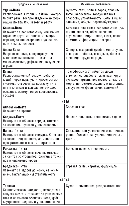 Вата-доша локализуется в теле ниже пупка, включая ноги, Питта – от пупка до груди, Капха – от груди и выше. И у каждой доши есть свои центры, или «дома»: у Ваты – толстый кишечник, Питты – тонкий кишечник и желудок, дом Капхи – лёгкие. Когда доши накапливаются в своих домах без меры, начинается их дисбаланс и они «выходят за границы своих домов». Тут-то и начинаются болячки.