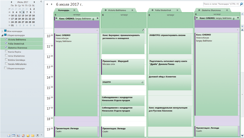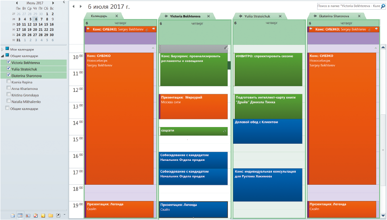 Например, сотруднику компании «Правила игры» хватает нескольких секунд просмотра сводных календарей консультантов, чтобы понять, кто чем занимается и какие есть свободные зоны для назначения встречи. Достаточно знать, что согласно корпоративному стандарту использования Outlook оранжевым цветом раскрашиваются выездные встречи, синим цветом — жестко запланированные встречи внутри офиса, а зеленым — бюджетируемые задачи, которые не имеют жестких рамок начала и окончания. Зная это, вы можете, взглянув на рис. 1.5, очень быстро понять, что Сергей Бехтерев и Екатерина Шаронова ведут выездную сессию в Новосибирске, Виктория Бехтерева встречается в обед с Клиентом в Москва-сити, а у Юлии Стратейчук вечером консультация в офисе. Кроме того, у Виктории, Сергея и Екатерины запланирована вечером скайп-встреча, причем Сергей и Екатерина будут участвовать в этой встрече удаленно.