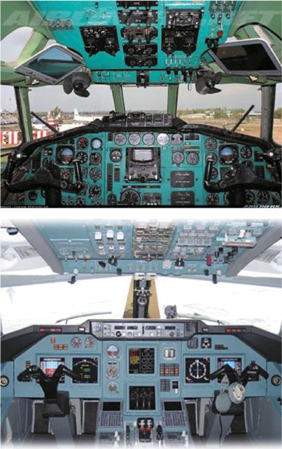 Рис. 1.7. Кабина пилотов устаревшего ТУ-154 (сверху) и современного ИЛ-96 (снизу)
