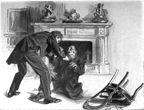 "There was a sudden rush from outside and Watkins either sprang or was pushed, probably the latter, through the door. At the same instant there was a flash, a report, a snarl, a loud cry, a tumult of feet. The smoke cleared slowly away, showing the door empty. Across the threshold lay a sophomore, while over him stood Jim, motionless, with his feet on the man's chest and his teeth close to his face.