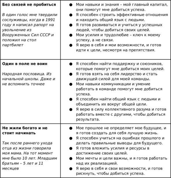 ↳ Я регулярно провожу ревизию своих убеждений. Записываю их в таблицу. Слева — ограничивающие убеждения. Обязательно делаю пометки, откуда они появились в моей голове. Справа — новые продвигающие и мотивирующие формулировки. Смотри пример в Таблице.