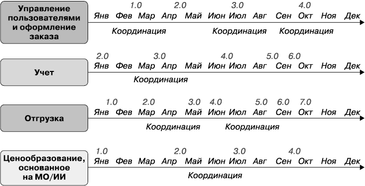Создание сложного программного обеспечения — тяжелая работа. В кино блестящий программист может за пару бессонных ночей героически создать продукт, способный изменить мир. В реальной жизни для получения качественного результата требуется много людей и уйма времени. Несколько команд, работающих над сложным проектом, обычно реализуют разные части общей системы, следуя своим планам и совершая шаги независимо. Периодически эти части необходимо интегрировать, чтобы устранить зависимости, для чего независимые команды должны координировать свою работу (рис. 1.1).
