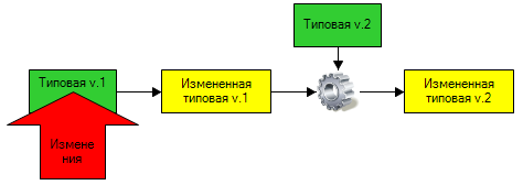 Для обновления измененной конфигурации уже требовалось участие квалифицированного специалиста. При этом чем больше и серьезнее были внесенные изменения, тем больше времени и усилий могло понадобиться специалисту, выполнявшему обновление. В случае пересечения изменений в обеих конфигурациях от специалиста могло потребоваться очень хорошее знание как самой типовой конфигурации, так и внесенных доработок. Этот процесс можно представить на следующей схеме (рис. 1.2).