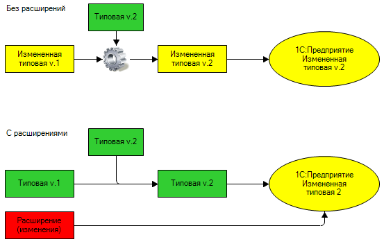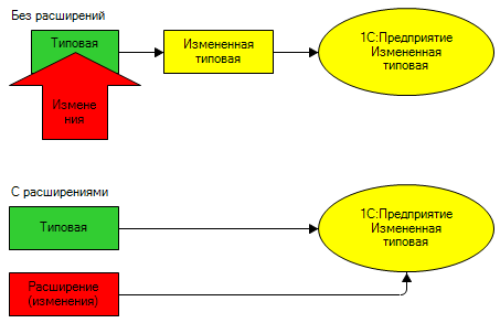 Чтобы упростить поддержку измененных конфигураций, в платформе «1С:Предприятие» был разработан (и продолжает развиваться) механизм расширений. С помощью расширений можно дорабатывать конфигурацию, не внося в нее изменений (не снимая с поддержки). Использование расширений существенно облегчает сопровождение типовых решений, которые нужно адаптировать к потребностям конкретного заказчика.
