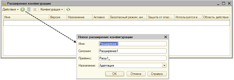 Кроме того, в расширение можно добавлять собственные объекты, созданные на основе прототипов, существующих внутри платформы. Работа с собственными объектами в расширении ничем не отличается от этого процесса в конфигурации.