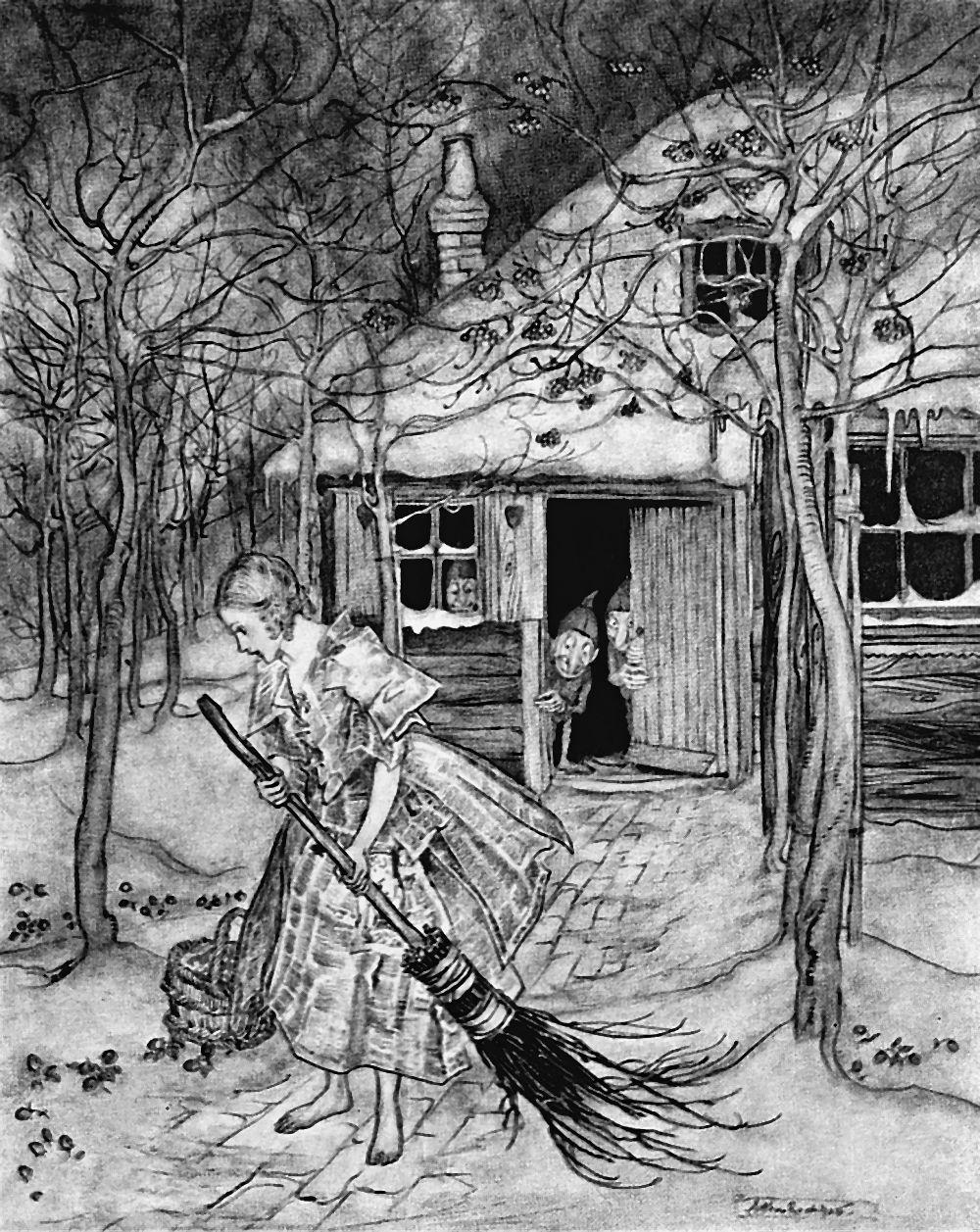 Nun war das Mädchen gehorsam, tat das Papierkleid an und ging mit dem Körbchen hinaus. Da war nichts als Schnee die Weite und Breite, und war kein grünes Hälmchen zu merken. Als es in den Wald kam, sah es ein kleines Häuschen, daraus guckten drei kleine Haulemännerchen. Es wünschte ihnen die Tageszeit und klopfte bescheidentlich an die Tür. Sie riefen herein und es trat in die Stube und setzte sich auf die Bank am Ofen, da wollte es sich wärmen und sein Frühstück essen. Die Haulemännerchen sprachen: »Gib uns auch etwas davon.« »Gern«, sprach es, teilte sein Stückchen Brot entzwei und gab ihnen die Hälfte. Sie fragten: »Was willst du zur Winterszeit in deinem dünnen Kleidchen hier im Wald.« »Ach«, antwortete es. »ich soll ein Körbchen voll Erdbeeren suchen und darf nicht eher nach Hause kommen, als bis ich es mitbringe.« Als es sein Brot gegessen hatte, gaben sie ihm einen Besen und sprachen: »Kehre damit an der Hintertür den Schnee weg.« Wie es aber draußen war, sprachen die drei Männerchen unter einander: »Was sollen wir ihm schenken, weil es so artig und gut ist und sein Brot mit uns geteilt hat?« Da sagte der erste: »Ich schenk ihm, daß es jeden Tag schöner wird.« Der zweite sprach: »Ich schenk ihm, daß Goldstücke ihm aus dem Mund fallen, so oft es ein Wort spricht.« Der dritte sprach: »Ich schenk ihm, daß ein König komm