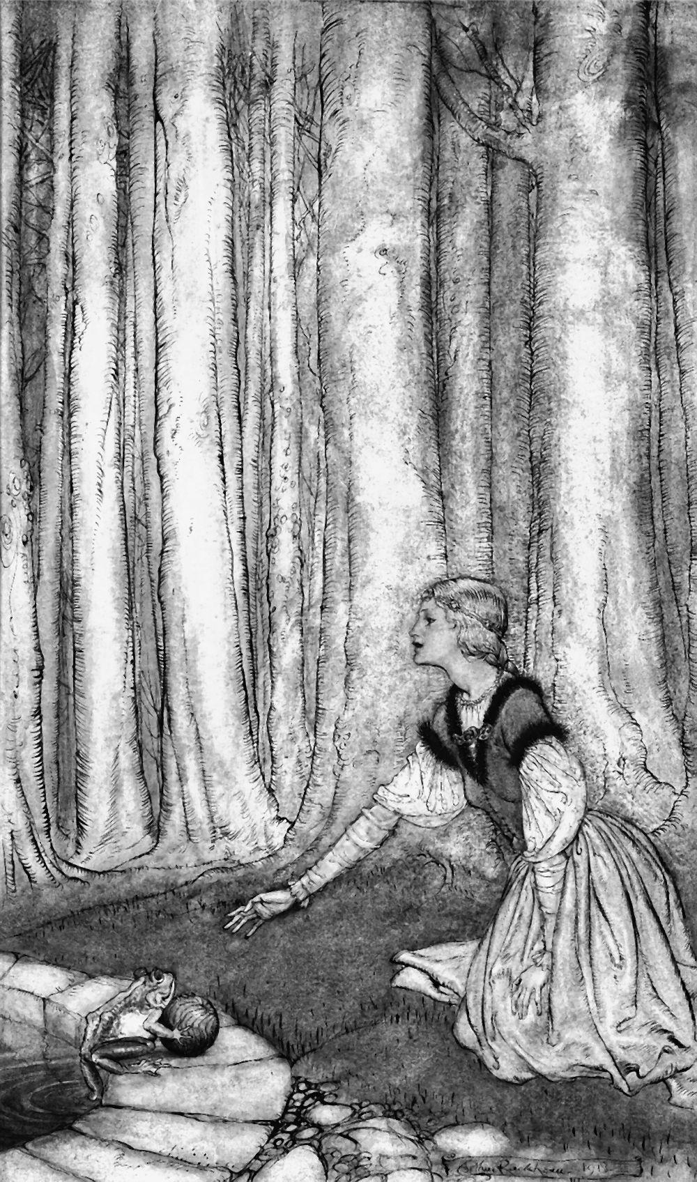 Nun trug es sich einmal zu, daß die goldene Kugel der Königstochter nicht in ihr Händchen fiel, das sie in die Höhe gehalten hatte, sondern vorbei auf die Erde schlug und geradezu ins Wasser hineinrollte. Die Königstochter folgte ihr mit den Augen nach, aber die Kugel verschwand, und der Brunnen war tief, so tief, daß man keinen Grund sah. Da fing sie an zu weinen und weinte immer lauter und konnte sich gar nicht trösten. Und wie sie so klagte, rief ihr jemand zu: »Was hast du vor, Königstochter, du schreist ja, daß sich ein Stein erbarmen möchte.« Sie sah sich um, woher die Stimme käme, da erblickte sie einen Frosch, der seinen dicken häßlichen Kopf aus dem Wasser streckte. »Ach, du bist's, alter Wasserpatscher«, sagte sie, »ich weine über meine goldene Kugel, die mir in den Brunnen hinabgefallen ist.« »Sei still und weine nicht«, antwortete der Frosch, »ich kann wohl Rat schaffen, aber was giebst du mir, wenn ich dein Spielwerk wieder heraushole?« »Was du haben willst, lieber Frosch«, sagte sie, »meine Kleider, meine Perlen und Edelsteine, auch noch die goldene Krone, die ich trage.« Der Frosch antwortete: »Deine Kleider, deine Perlen und Edelsteine, und deine goldene Krone, die mag ich nicht; aber wenn du mich lieb haben willst und ich soll dein Geselle und Spielkamerad sein, an deinem Tischlein neben dir sitzen, von deinem goldenen Tellerlein essen, aus deinem Becherlein trinken, in deinem Bettlein schlafen: wenn du mir das versprichst, so will ich hinuntersteigen und dir die goldene Kugel wieder herausholen.« »Ach ja«, sagte sie, »ich verspreche dir alles, was du willst, wenn du mir nur die Kugel wieder bringst.« Sie dachte aber: »Was der einfältige Frosch schwätzt, der sitzt im Wasser bei seinesgleichen und quakt, und kann keines Menschen Geselle sein.«