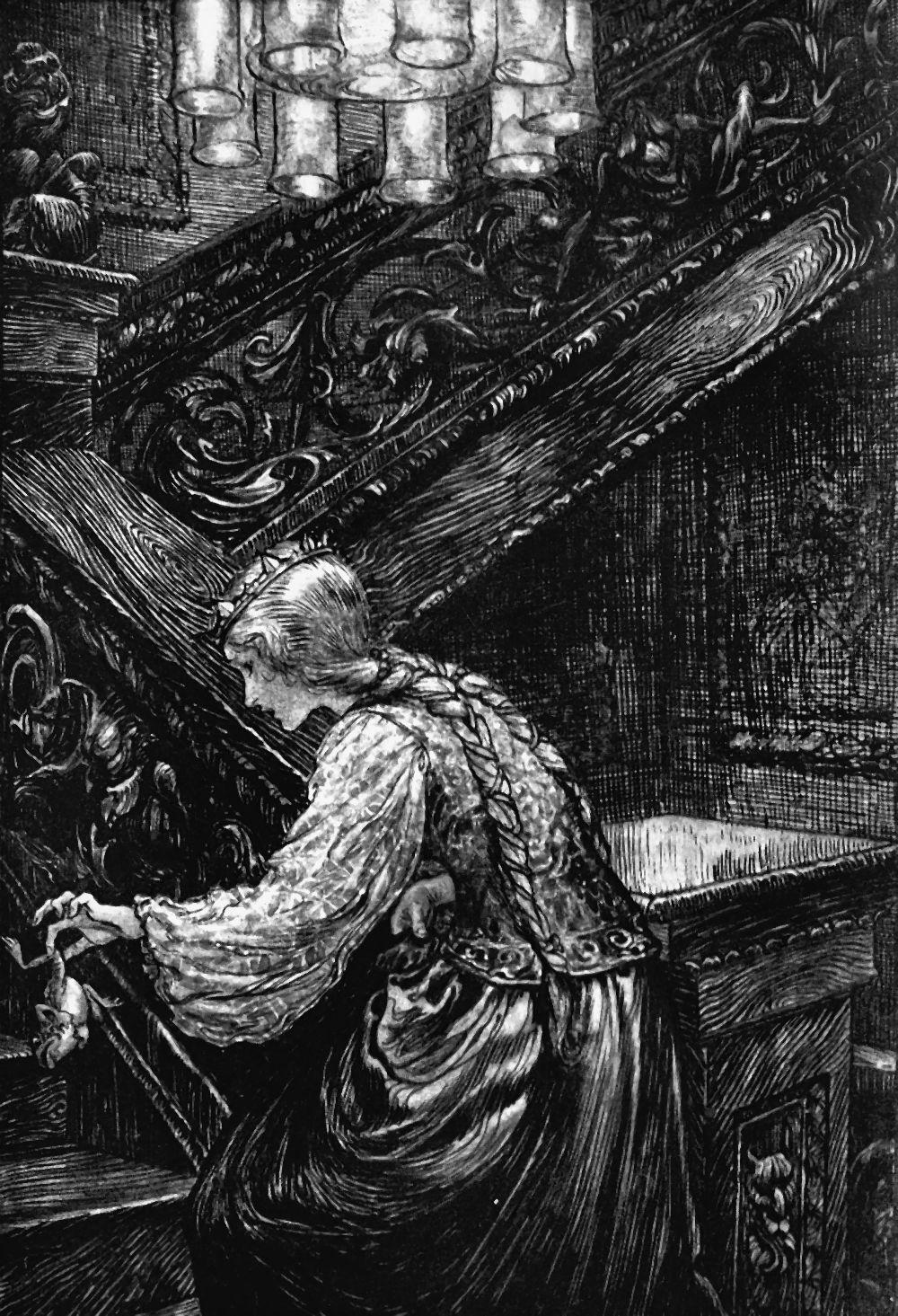 Da sagte der König: »Was du versprochen hast, das mußt du auch halten; geh nur und mach ihm auf.« Sie ging und öffnete die Tür, da hüpfte der Frosch herein, ihr immer auf dem Fuße nach, bis zu ihrem Stuhl. Da saß er und rief: »Heb mich herauf zu dir.« Sie zauderte, bis es endlich der König befahl. Als der Frosch erst auf dem Stuhl war, wollte er auf den Tisch, und als er da saß, sprach er: »Nun schieb mir dein goldenes Tellerlein näher, damit wir zusammen essen.« Das tat sie zwar, aber man sah wohl, daß sie's nicht gerne tat. Der Frosch ließ sich's gut schmecken, aber ihr blieb fast jedes Bißlein im Halse. Endlich sprach er: »Ich habe mich satt gegessen, und bin müde, nun trag mich in dein Kämmerlein und mach dein seiden Bettlein zurecht, da wollen wir uns schlafen legen.«