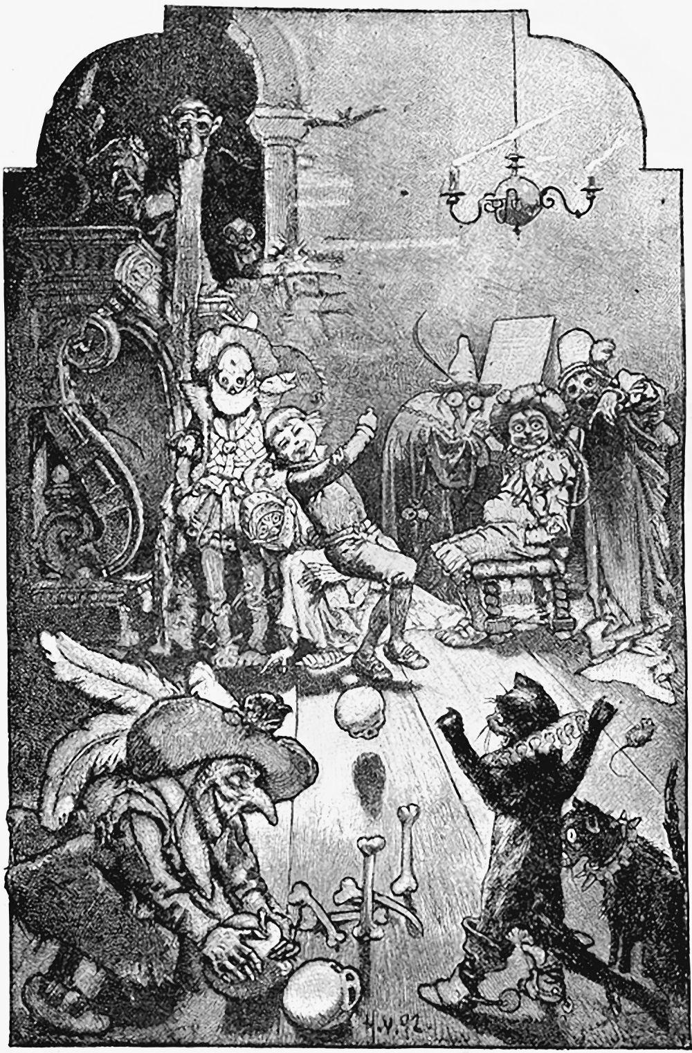 »Ach, wenn mir's nur gruselte!« sprach er, »aber hier werde ich's auch nicht lernen.« Gegen Mitternacht wollte er sich sein Feuer einmal aufschüren: wie er so hineinblies, da schrie's plötzlich aus einer Ecke: »Au, miau! was uns friert!« »Ihr Narren«, rief er, »was schreit ihr? Wenn euch friert, kommt, setzt euch ans Feuer und wärmt euch.« Und wie er das gesagt hatte, kamen zwei große schwarze Katzen in einem gewaltigen Sprunge herbei, setzten sich ihm zu beiden Seiten, und sahen ihn mit ihren feurigen Augen ganz wild an. Über ein Weilchen, als sie sich gewärmt hatten, sprachen sie: »Kamerad, wollen wir eins in der Karte spielen?« »Warum nicht?« antwortete er, »aber zeigt einmal eure Pfoten her.« Da streckten sie die Krallen aus. »Ei«, sagte er, »was habt ihr lange Nägel: wartet, die muß ich euch erst abschneiden!« Damit packte er sie beim Kragen, hob sie auf die Schnitzbank und schraubte ihnen die Pfoten fest. »Euch habe ich auf die Finger gesehen«, sprach er, »da vergeht mir die Lust zum Kartenspiel«, schlug sie tot und warf sie hinaus ins Wasser. Als er aber die zwei zur Ruhe gebracht hatte und sich wieder zu seinem Feuer setzen wollte, da kamen aus allen Ecken und Enden schwarze Katzen und schwarze Hunde an glühenden Ketten, immer mehr und mehr, daß er sich nicht mehr bergen konnte; die schrien greulich, traten ihm auf sein Feuer, zerrten es auseinander und wollten es ausmachen. Das sah er ein Weilchen ruhig mit an, als es ihm aber zu arg ward, faßte er sein Schnitzmesser und rief: »Fort mit dir, du Gesindel«, und haute auf sie los. Ein Teil sprang weg, die anderen schlug er tot und warf sie hinaus in den Teich. Als er wieder gekommen war, blies er aus den Funken sein Feuer frisch an und wärmte sich. Und als er so saß, wollten ihm die Augen nicht länger offen bleiben und er bekam Lust zu schlafen. Da blickte er um sich und sah in der Ecke ein großes Bett: »Das ist mir eben recht«, sprach er und legte sich hinein. Als er aber die Augen zutun wollte, so fing das Bett von selbst an zu fahren und fuhr im ganzen Schloß herum. »Recht so«, sprach er, »nur besser zu.« Da rollte das Bett fort, als wären sechs Pferde vorgespannt, über Schwellen und Treppen auf und ab; auf einmal hopp hopp! warf es um, das unterste zu oberst, daß es wie ein Berg auf ihm lag. Aber er schleuderte Decken und Kissen in die Höhe, stieg heraus und sagte: »Nun mag fahren wer Lust hat«, legte sich an sein Feuer und schlief, bis es Tag war. Am Morgen kam der König, und als er ihn da auf der Erde liegen sah, meinte er, die Gespenster hätten ihn umgebracht, und er wäre tot. Da sprach er: »Es ist doch schade um den schönen Menschen.« Das hörte der Junge, richtete sich auf und sprach: »So weit ist's noch nicht!« Da verwunderte sich der König, freute sich aber, und fragte wie es ihm gegangen wäre. »Recht gut«, antwortete er, »eine Nacht wäre herum, die zwei anderen werden auch herumgehen.« Als er zum Wirt kam, da machte der große Augen. »Ich dachte nicht«, sprach er, »daß ich dich wieder lebendig sehen würde; hast du nun gelernt, was Gruseln ist?« »Nein«, sagte er, »es ist alles vergeblich; wenn mir's nur einer sagen könnte!«
