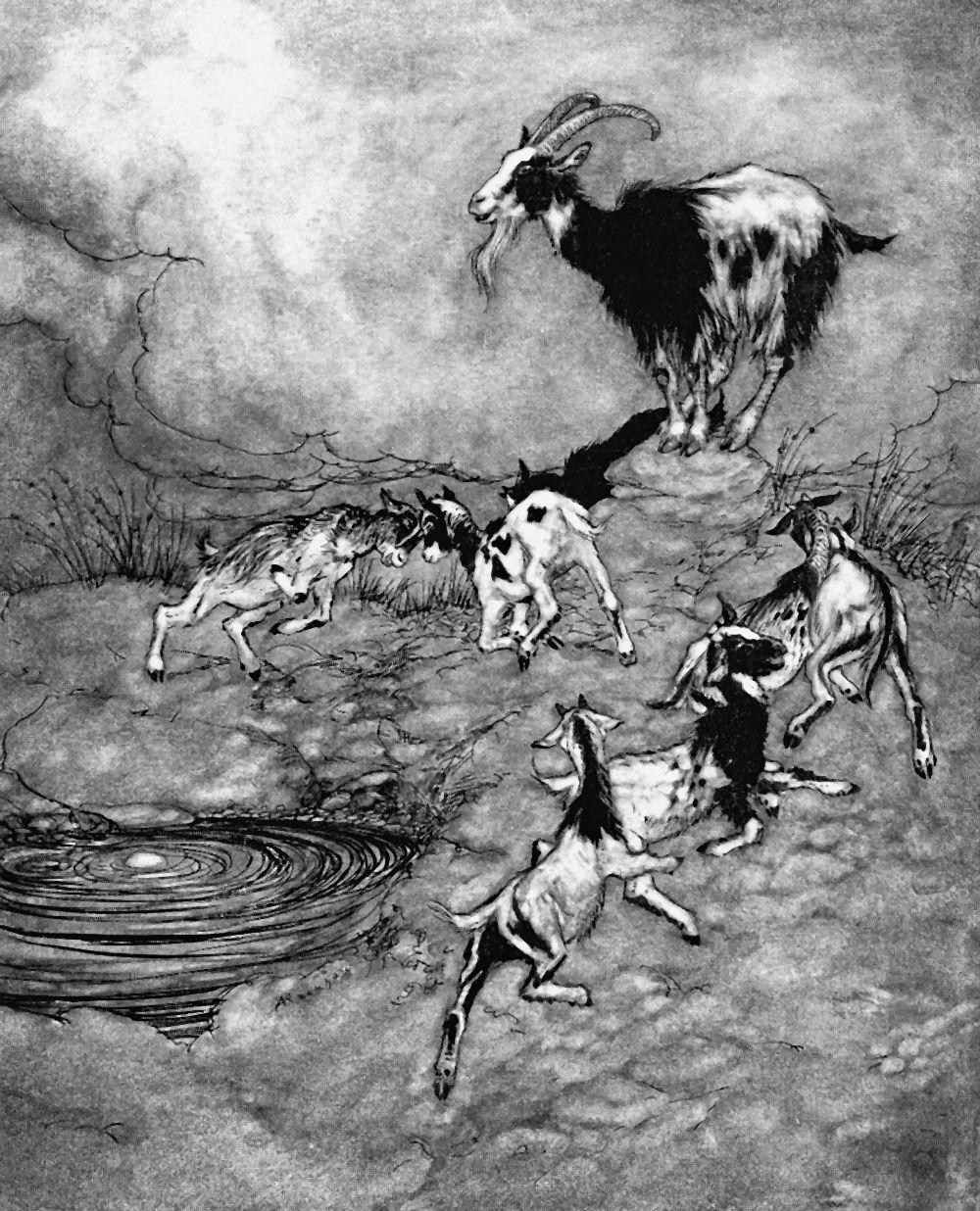Als der Wolf endlich ausgeschlafen hatte, machte er sich auf die Beine, und weil ihm die Steine im Magen so großen Durst erregten, so wollte er zu einem Brunnen gehen und trinken. Als er aber anfing zu gehen und sich hin und her zu bewegen, so stießen die Steine in seinem Bauch aneinander und rappelten. Da rief er: