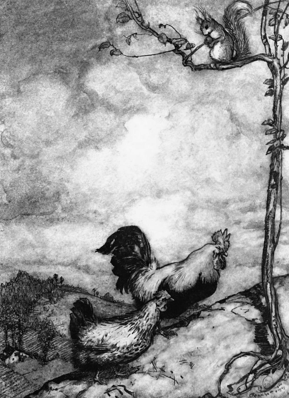 Hähnchen sprach zum Hühnchen: »Jetzt ist die Zeit, wo die Nüsse reif werden, da wollen wir zusammen auf den Berg gehen und uns einmal recht satt essen, ehe sie das Eichhorn alle wegholt.« »Ja«, antwortete das Hühnchen, »komm, wir wollen uns eine Lust miteinander machen.« Da gingen sie zusammen fort auf den Berg, und weil es ein heller Tag war, blieben sie bis zum Abend. Nun weiß ich nicht, ob sie sich so dick gegessen hatten, oder ob sie übermütig geworden waren, kurz, sie wollten nicht zu Fuß nach Haus gehen, und das Hähnchen mußte einen kleinen Wagen von Nußschalen bauen. Als er fertig war, setzte sich Hühnchen hinein und sagte zum Hähnchen: »Du kannst dich nur immer vorspannen.« »Du kommst mir recht«, sagte das Hähnchen, »lieber geh ich zu Fuß nach Haus, als daß ich mich vorspannen lasse: nein, so haben wir nicht gewettet. Kutscher will ich wohl sein und auf dem Bock sitzen, aber selbst ziehen, das tu' ich nicht.«
