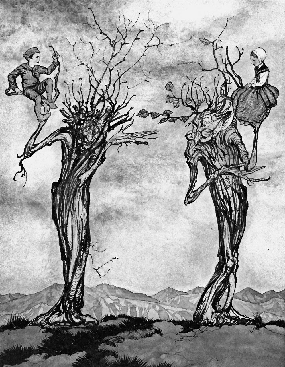 Am anderen Morgen, als sie aufwachten, stand die Sonne schon hoch am Himmel und schien heiß in den Baum hinein. Da sprach das Brüderchen: »Schwesterchen, mich dürstet, wenn ich ein Brünnlein wüßte, ich ging und tränk einmal; ich mein, ich hörte eins rauschen.« Brüderchen stand auf, nahm Schwesterchen an der Hand, und sie wollten das Brünnlein suchen. Die böse Stiefmutter aber war eine Hexe und hatte wohl gesehen, wie die beiden Kinder fortgegangen waren, war ihnen nachgeschlichen, heimlich, wie die Hexen schleichen, und hatte alle Brunnen im Walde verwünscht. Als sie nun ein Brünnlein fanden, das so glitzerig über die Steine sprang, wollte das Brüderchen daraus trinken, aber das Schwesterchen hörte wie es im Rauschen sprach: »Wer aus mir trinkt, wird ein Tiger; wer aus mir trinkt, wird ein Tiger.« Da rief das Schwesterchen: »Ich bitte dich, Brüderchen, trink nicht, sonst wirst du ein wildes Tier und zerreißt mich.« Das Brüderchen trank nicht, ob es gleich so großen Durst hatte, und sprach: »Ich will warten bis zur nächsten Quelle.« Als sie zum zweiten Brünnlein kamen, hörte das Schwesterchen, wie auch dieses sprach: »Wer aus mir trinkt, wird ein Wolf: wer aus mir trinkt, wird ein Wolf.« Da rief das Schwesterchen: »Brüderchen, ich bitte dich, trink nicht, sonst wirst du ein Wolf und frißt mich.« Das Brüderchen trank nicht und sprach: »Ich will warten, bis wir zur nächsten Quelle kommen, aber dann muß ich trinken, du magst sagen, was du willst: mein Durst ist gar zu groß.« Und als sie zum dritten Brünnlein kamen, hörte das Schwesterlein, wie es im Rauschen sprach: »Wer aus mir trinkt, wird ein Reh, wer aus mir trinkt, wird ein Reh.« Das Schwesterchen sprach: »Ach Brüderchen, ich bitte dich, trink nicht, sonst wirst du ein Reh und läufst mir fort.« Aber das Brüderchen hatte sich gleich beim Brünnlein niedergekniet, hinabgebeugt und von dem Wasser getrunken und wie die ersten Tropfen auf seine Lippen gekommen waren, lag es da als ein Rehkälbchen.
