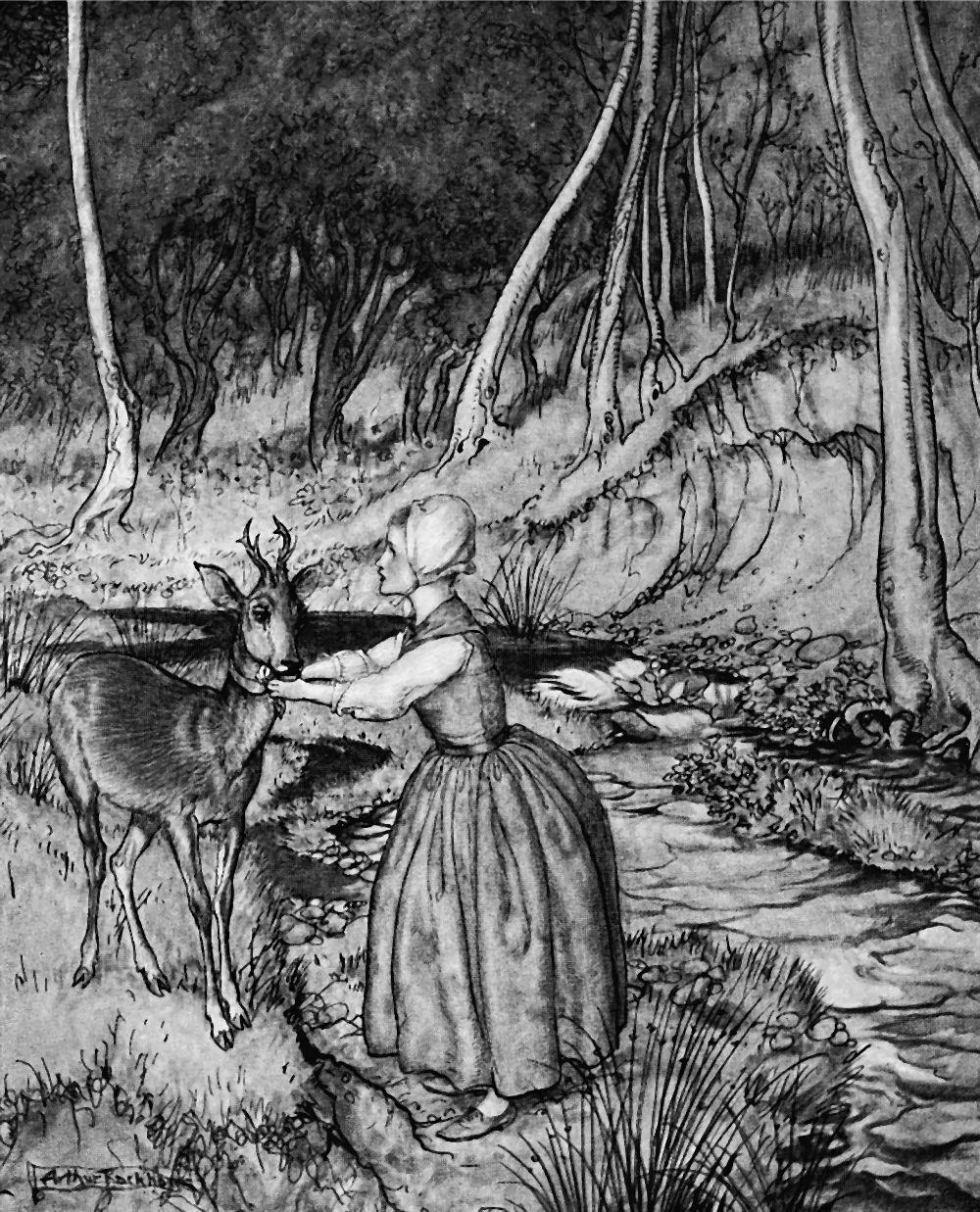 Nun weinte das Schwesterchen über das arme verwünschte Brüderchen, und das Rehchen weinte auch und saß so traurig neben ihm. Da sprach das Mädchen endlich: »Sei still, liebes Rehchen, ich will dich ja nimmermehr verlassen.« Dann band es sein goldenes Strumpfband ab und tat es dem Rehchen um den Hals, und rupfte Binsen und flocht ein weiches Seil daraus. Daran band es das Tierchen und führte es weiter, und ging immer tiefer in den Wald hinein. Und als sie lange, lange gegangen waren, kamen sie endlich an ein kleines Haus, und das Mädchen schaute hinein, und weil es leer war, dachte es: »Hier können wir bleiben und wohnen.« Da suchte es dem Rehchen Laub und Moos zu einem weichen Lager, und jeden Morgen ging es aus und sammelte sich Wurzeln, Beeren und Nüsse, und für das Rehchen brachte es zartes Gras mit, das fraß es ihm aus der Hand, war vergnügt und spielte vor ihm herum. Abends, wenn Schwesterchen müde war und sein Gebet gesagt hatte, legte es seinen Kopf auf den Rücken des Rehkälbchens, das war sein Kissen, darauf es sanft einschlief. Und hätte das Brüderchen nur seine menschliche Gestalt gehabt, es wäre ein herrliches Leben gewesen.