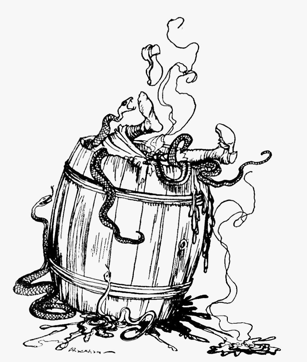 Am anderen Morgen, als die beiden Mädchen sich aufmachten, da stand vor des Mannes Tochter Milch zum Waschen und Wein zum Trinken, vor der Frau Tochter aber stand Wasser zum Waschen und Wasser zum Trinken. Am zweiten Morgen stand Wasser zum Waschen und Wasser zum Trinken so gut vor des Mannes Tochter als vor der Frau Tochter. Und am dritten Morgen stand Wasser zum Waschen und Wasser zum Trinken vor des Mannes Tochter, und Milch zum Waschen und Wein zum Trinken vor der Frau Tochter, und dabei blieb's. Die Frau ward ihrer Stieftochter spinnefeind und wußte nicht wie sie es ihr von einem Tag zum andern schlimmer machen sollte. Auch war sie neidisch, weil ihre Stieftochter schön und lieblich war, ihre rechte Tochter aber häßlich und widerlich.