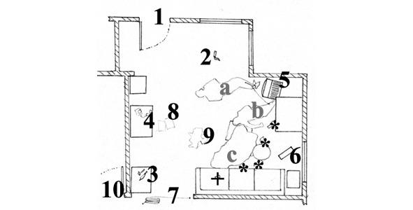 Причём её положили либо под голову трупа, либо незадолго до наступления смерти Уингейта, поскольку под головой Дэйна уже успела появиться большая лужа крови. В эту-то лужу подушку и положили, так что она оказалась пропитана кровью с двух сторон — снизу, со стороны лужи крови, и сверху — в силу кровотечения из головы Дэйна. На полу гостиной отчётливо просматривался кровавый след волочения тела Джона длиною более 1 м. Из этого следовало, что первые удары он получил ближе к кухне, где и упал на пол, после чего его тело для чего-то переместили в сторону входной двери.